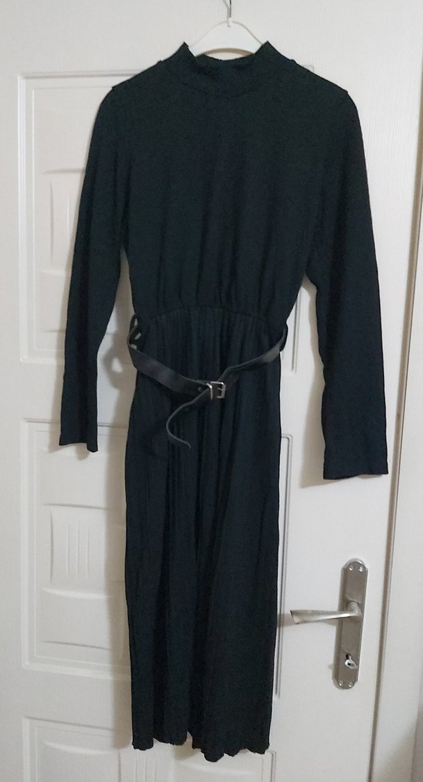 Siyah, kemerli, uzun ve fit kesim elbise, yüksek yakalı ve askılı kolludur. Yumuşak keten kumaştan yapılmıştır, minimalist ve avangart tarz için uygundur.