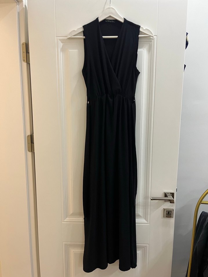 Bu siyah uzun elbise V yakalı ve kalın askılıdır. Kemerli ve sentetik kumaştan yapılmıştır. İki yada üç kere giyilmiştir. L bedendir. Herhangi bir kusuru yok.