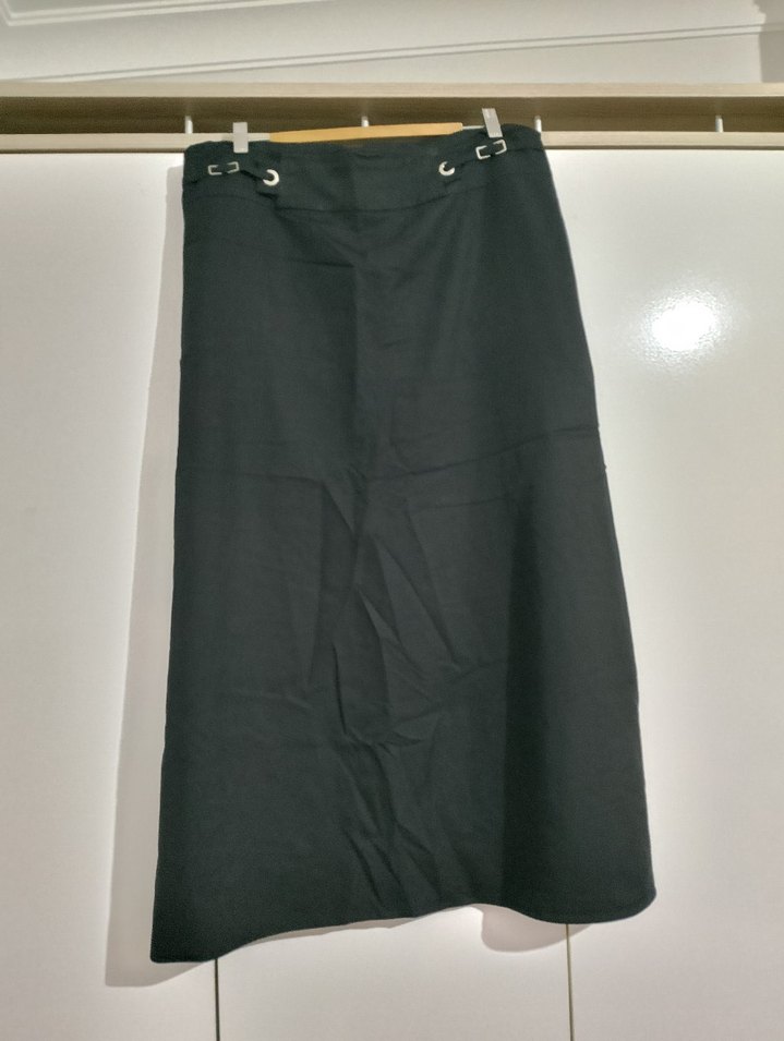 Siyah renkli, kemerli ve regular fit uzun etek. Minimalist gotik tarzıyla günlük kullanıma uygundur. Pazarlık payı vardır.