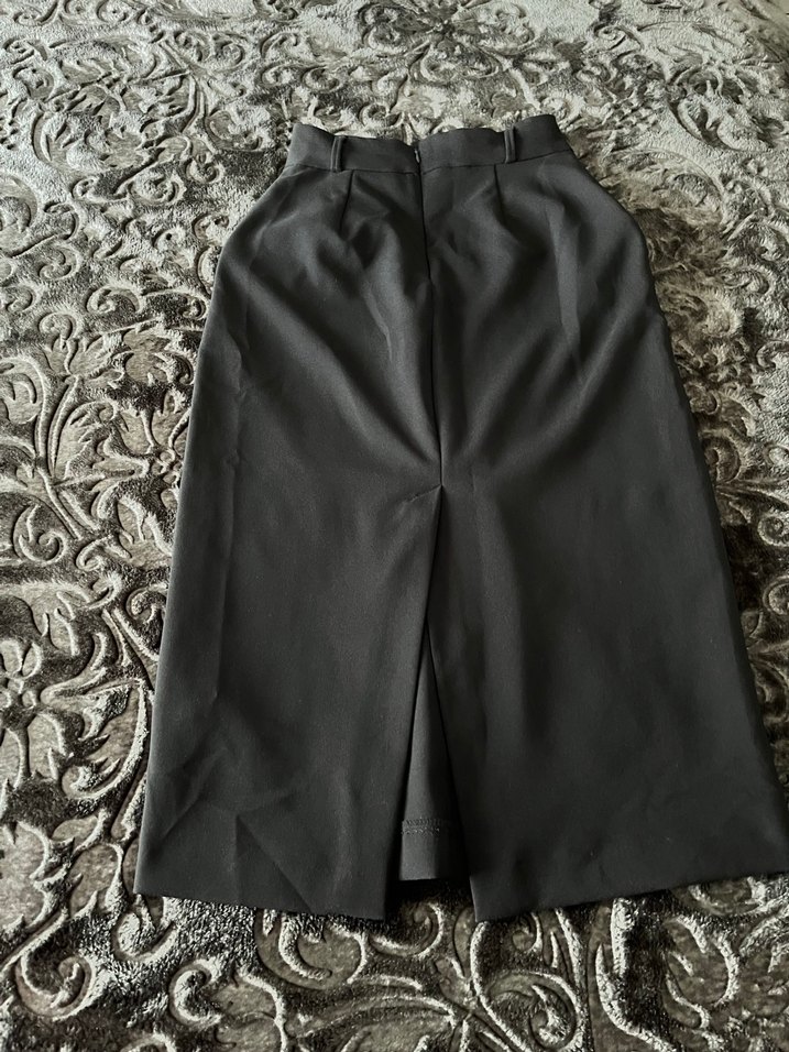 Siyah renkte, kemerli ve düz tasarımlı uzun kadın eteği. Sentetik kumaştan üretilmiş, klasik şıklık ve gotik stile uygun, ofis kullanımı için ideal.