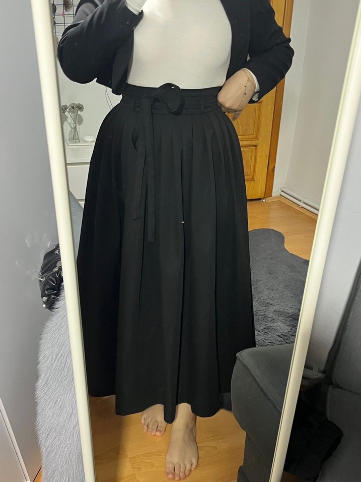Siyah, kemerli, uzun ve bol kesim kadın etek. Aybike markası Düz, desen içermeyen yapısı günlük ve iş stiline uygundur. Yumuşak sentetik kumaştan üretilmiştir.