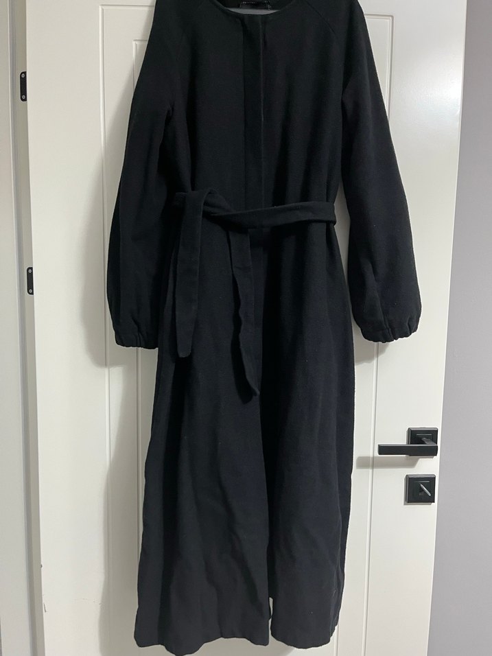 Siyah uzun kadın kaban, yüksek yakalı ve uzun kolludur. Yumuşak ve sıcak kumaştan içi astarlı bilekten bi karış yukarıda bitiyor boyu 160 boy 65 67 kg ile giyildi 42 beden
