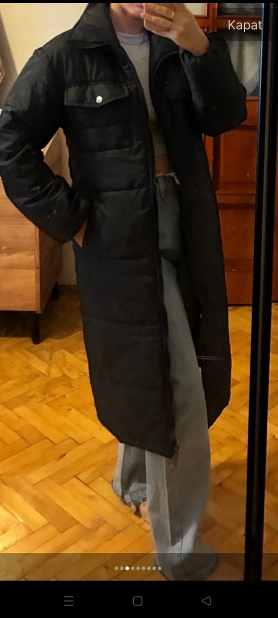 Siyah, kemerli, uzun kışlık mont, kemerli bel, çıtçıtlı yakalı ve askılı kollu. Günlük kullanıma uygun, rahat kesim ve sentetik kumaştan yapılmıştır. Tertemiz., s beden, xs yazıyor ama bol olur