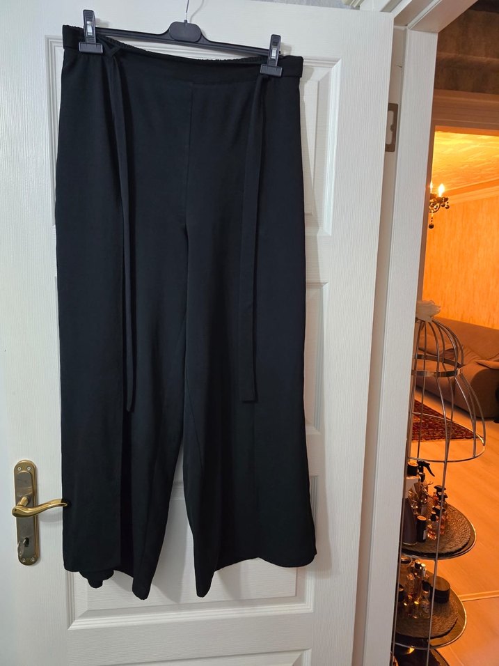 Siyah, uzun, kemerli ve bol kesim kadın kumaş pantolon. Ofis kullanımı için uygun, ipeksi dokulu.