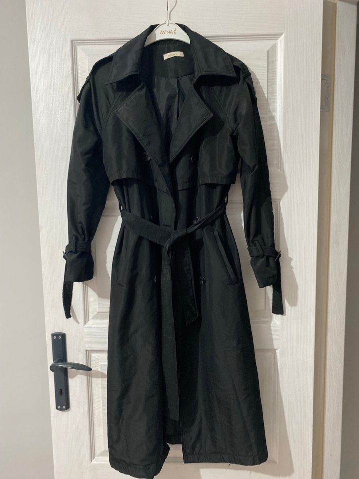 Siyah, kemerli, cepliuzun trençkot. Notlu yaka ve kayış detaylı kollarıyla klasik Paris tarzını yansıtır. Rahat ve düzenli kesim. Herhangi kusuru yok Boyu:115 cm/ikikolaltı:49 düğmelerle genişletme kısaltma payı mevcut