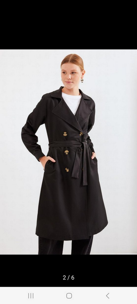 Siyah renkli, kemerli ve uzun kollu kadın trençkot. Notlu yaka ve düz desensiz, ofis ve günlük stil için uygun, rahat kesim.