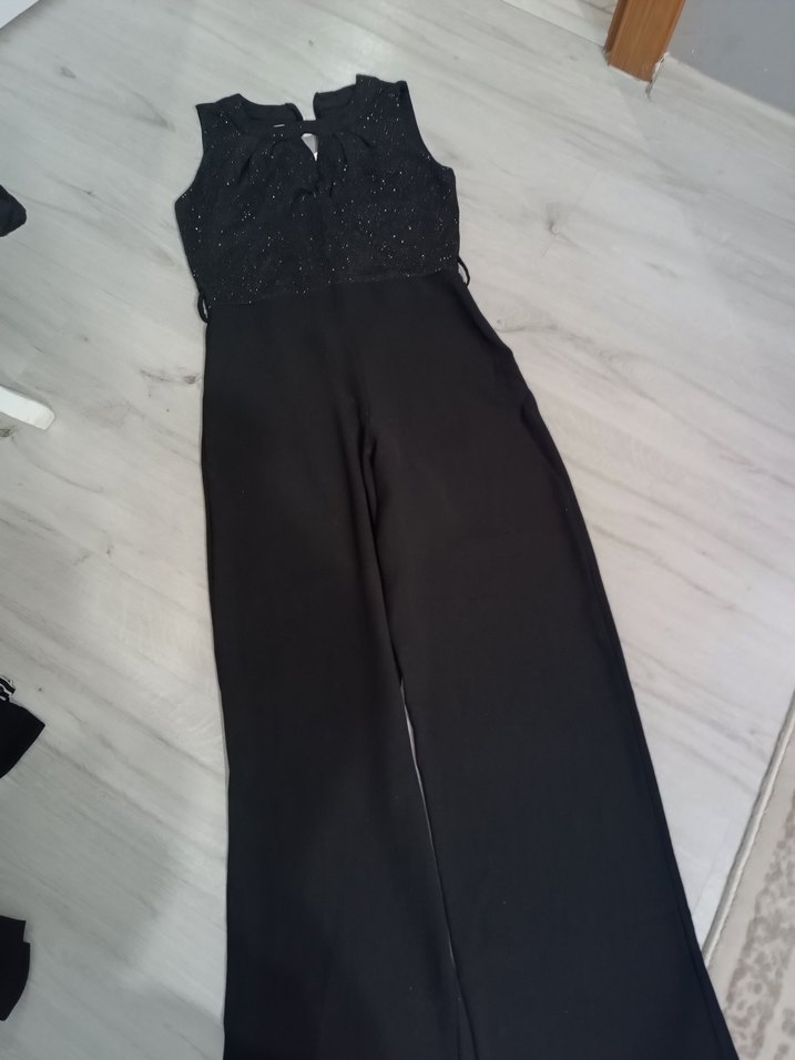 bir kez giydim kemeri mevcutSiyah, kolsuz, V yakalı ve kemerli bel detaylı tulum. Regular fit ve pürüzsüz sentetik kumaştan, düğün için uygun.