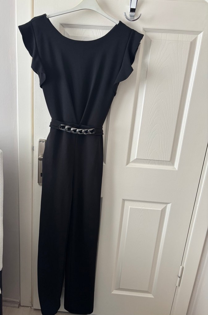 Siyah kemerli, uzun ve vücuda oturan tulum, yuvarlak yaka ve askılı kollara sahiptir. Düz, sentetik kumaştan yapılmıştır ve ofis ya da günlük şıklık için uygundur.
