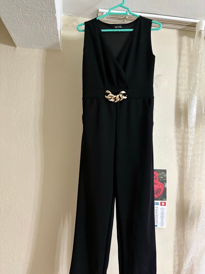 Siyah, kolsuz tulum, V yaka ve kemerli detaylarla sade ve şık. Ofis ve günlük kullanıma uygun, ince ve pürüzsüz kumaştan yapılmıştır.