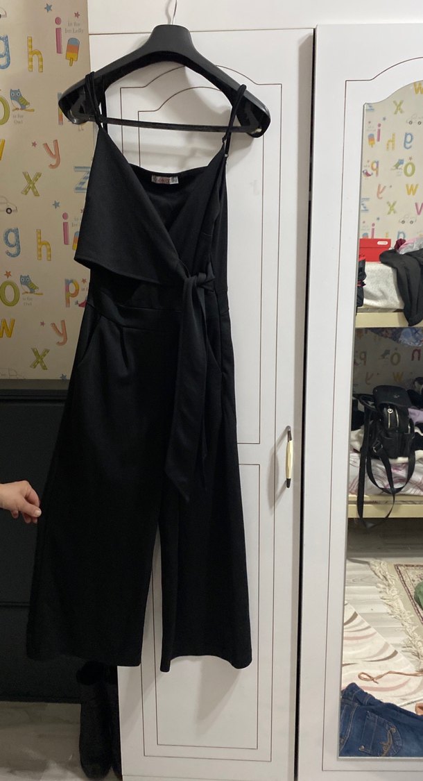 Siyah, kemerli ve straplez yakalı kadın tulumu, bol kesimi ve ipeksi dokusuyla minimal ve şık bir görünüm sunar. Ofis için uygun, kolsuz ve desensiz.