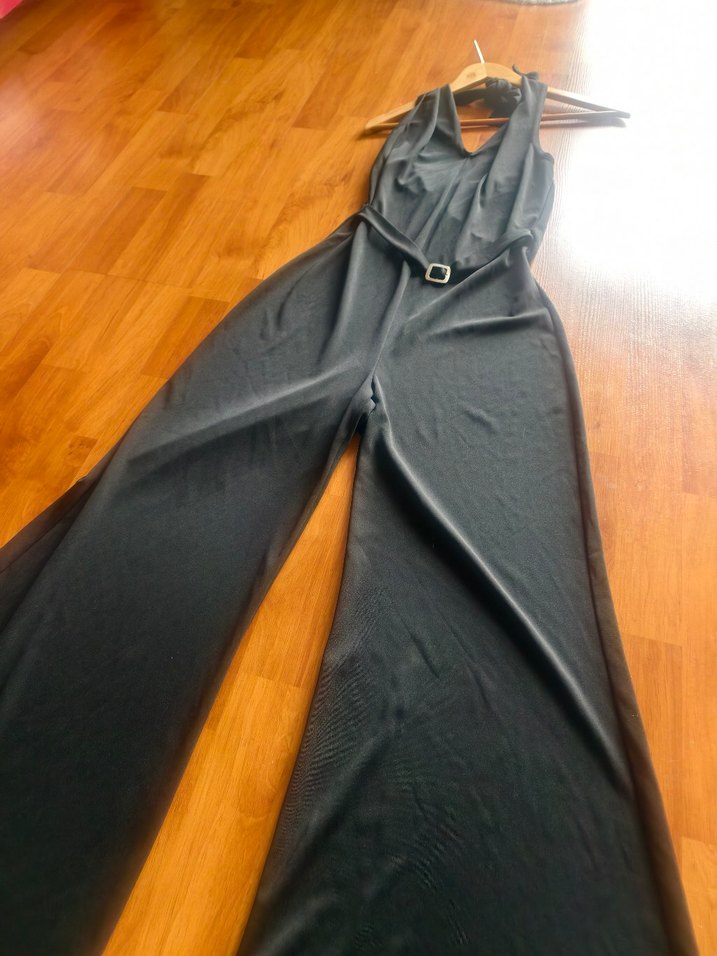 Siyah, kemerli ve uzun kesim tulum, satenimsi dokusu, yakalı ve askılı tasarımıyla şık bir parti kombini sunar.