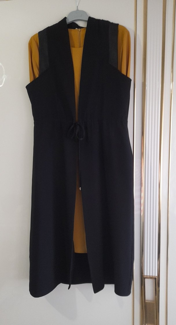 Kemerli bel ve yaka detaylı, uzun siyah kadın yeleği. Sentetik kumaştan, minimalist ve normcore tarzıyla ofis kullanımı için uygundur.