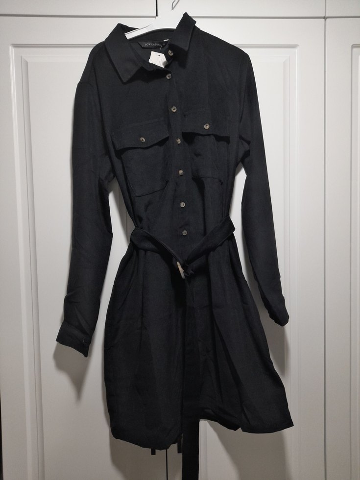 Siyah renkli, keten kumaştan, uzun kollu, kemerli ve geniş kesim elbise. Notch yaka ve günlük kullanım için uygun. etiketli. 36 38 beden kısa günlük elbise şık