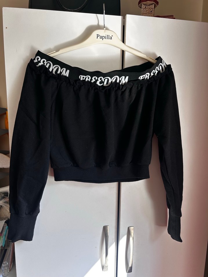 Uzun kollu, siyah crop sweatshirt. Tekne yaka ve "FREEDOM" yazılı kemer detayı bulunur. Pamuklu, bol kesim, rahat kullanım için uygundur.