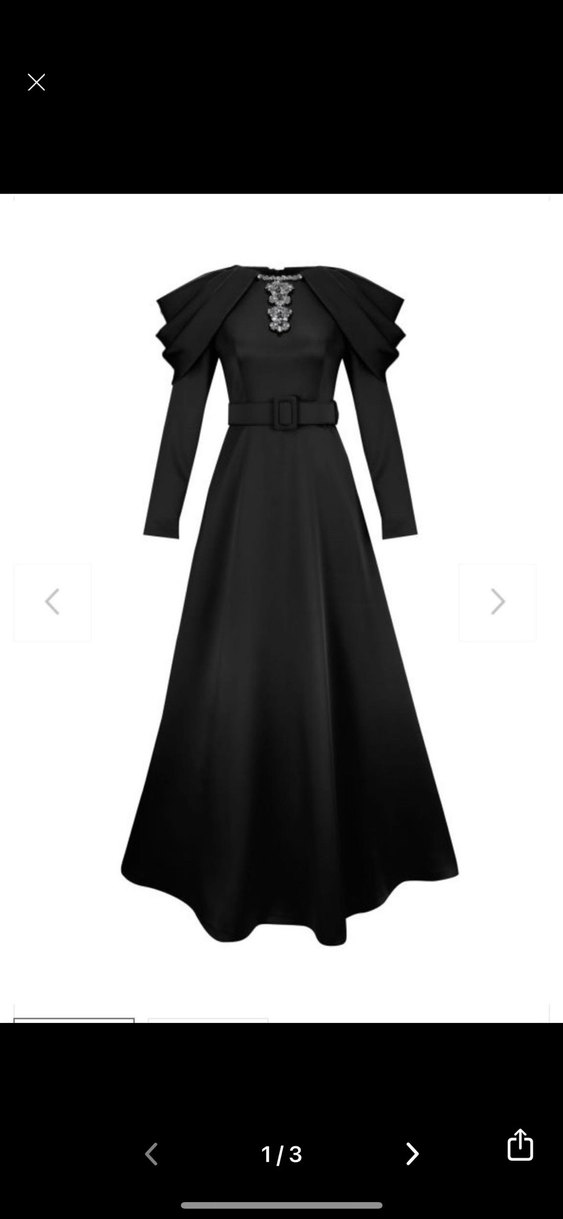 Siyah renkli, V yakalı ve uzun kollu bu uzun abiye elbise kemerli ve gotik tarzda klasik şıklık sunar. Düğün için uygun, sade ve düzenli kesim.