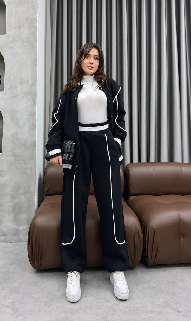 Kadınlar için regular fit, kemerli, uzun kollu ve yakalı siyah eşofman takımı. Yumuşak ve sıcak kumaştan, beyaz şerit detaylarla günlük kullanıma uygun.