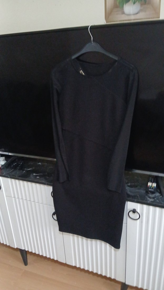 Siyah, kemerli, uzun kollu, bisiklet yakalı, midi uzunlukta, yumuşak ve sıcak dokulu triko elbisedir.