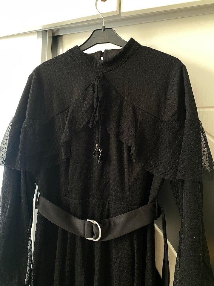 Yüksek yakalı, askılı kollu, kemerli ve dokulu siyah uzun elbise. Tesettür tarz için uygun.