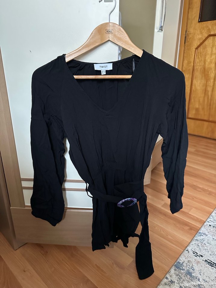 Siyah, kemerli uzun kollu ve V yakalıdır. İpeksi kumaştan yapılmış, midi boyunda ve rahat kesimlidir. Günlük kullanıma uygun minimalist gotik tarzda.