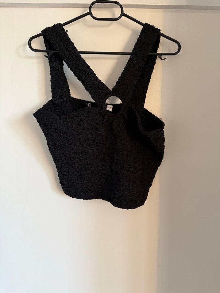 Kemer detaylı, V yakalı, kısa kesim siyah crop top. Keten kumaştan, dar kesim ve askılı tasarımda, günlük kullanıma uygun goth tarzı.