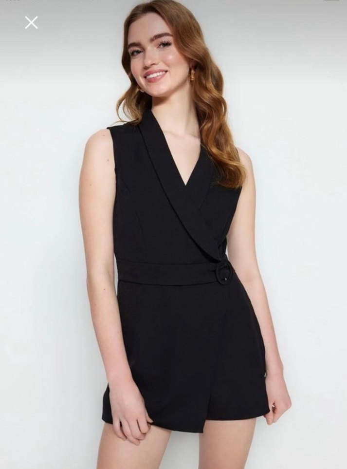 Siyah, kolsuz kısa tulum, V yaka ve kemerli bel detayına sahiptir. Ofis ve sokak stili için uygun, düz ve desensiz tasarım sunar.