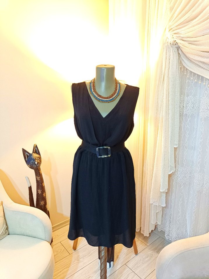 Siyah renkli, V yakalı ve kolsuz midi elbise. Kemer detayıyla belden oturan, rahat ve çağdaş bir kesime sahiptir. Ofis için ideal klasik şıklık.