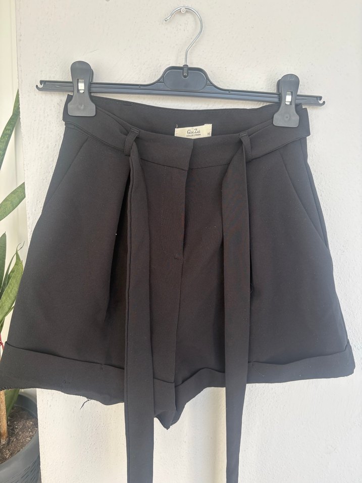 Siyah, kemerli yüksek bel mini şort, bol kesimi ve düz dokusu ile günlük sokak stiline uygundur.
