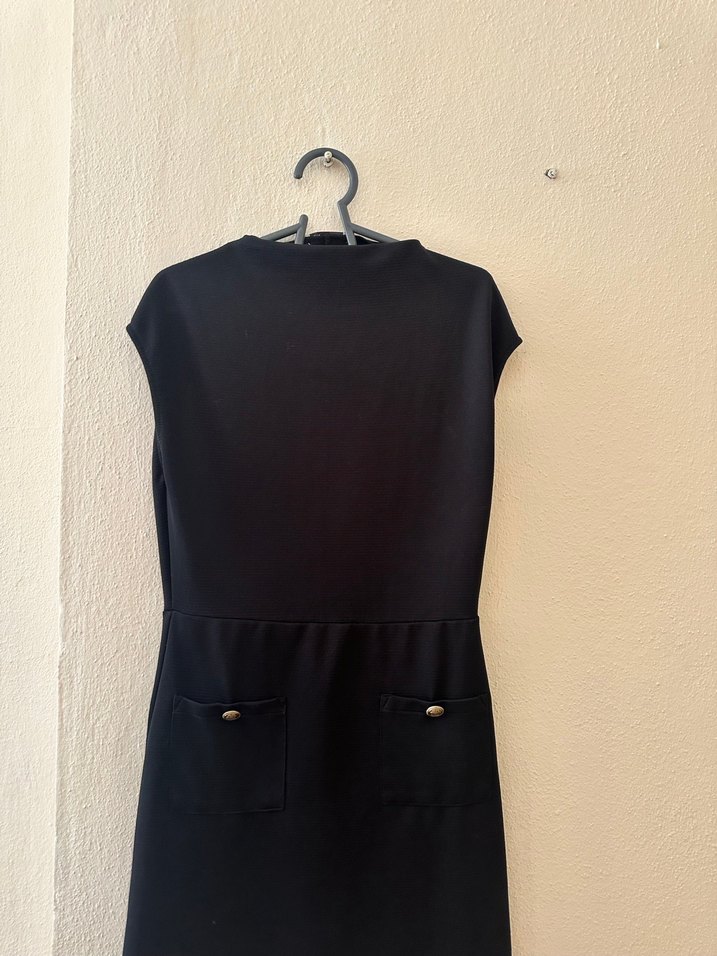 Siyah, yüksek yakalı, kolsuz ve kemerli triko elbise. Minimalist ve gotik tarzıyla ofis için uygun şık bir modeldir.