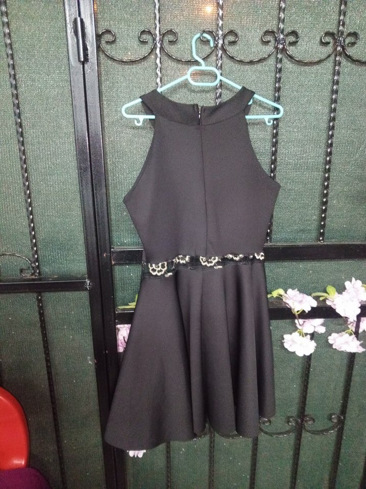 Siyah renkli, yüksek yakalı ve kemerli, vücuda oturan kadın gece elbisesi. Sentetik ve pürüzsüz kumaştan, kolsuz tasarım goth stilini yansıtıyor.