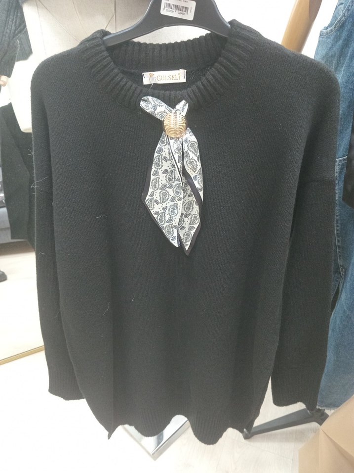 Siyah renkli, örgü dokulu, yuvarlak yakalı ve uzun kollu kadın kazak. Yılan desenli ve broşlu fular detaylı, rahat kesimle günlük kullanıma uygun.Stanfart beden