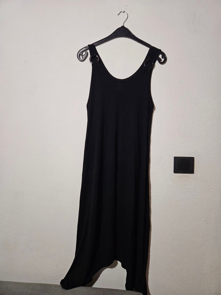 Siyah Keten Askılı Uzun Salaş Elbise