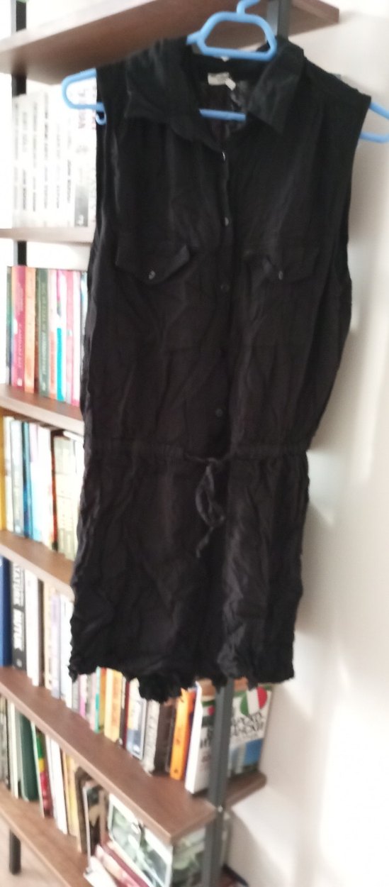 Siyah keten hamile tulumu yüksek yakalı ve askılı kolludur. Bol kesim ve kemerli bel ile günlük kullanıma uygun gotik tarz sunar.