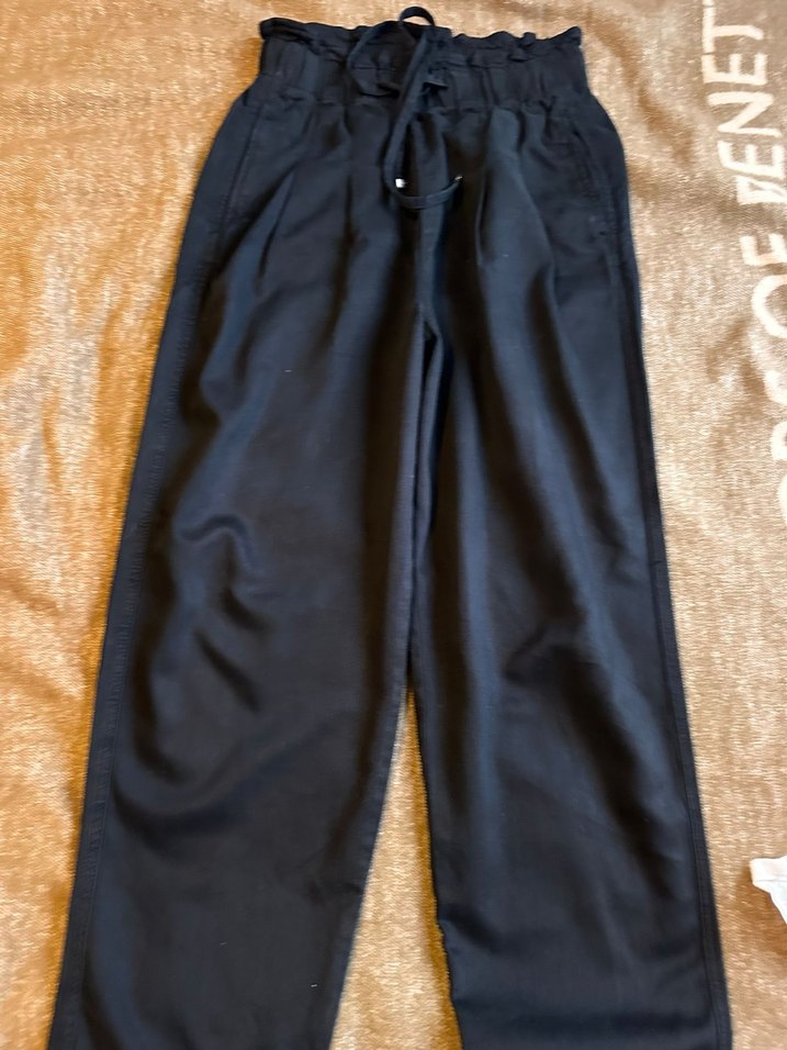 Siyah keten kumaştan, beli bağlamalı, bol kesim midi boy pantolon. Günlük kullanım için rahat ve şık.