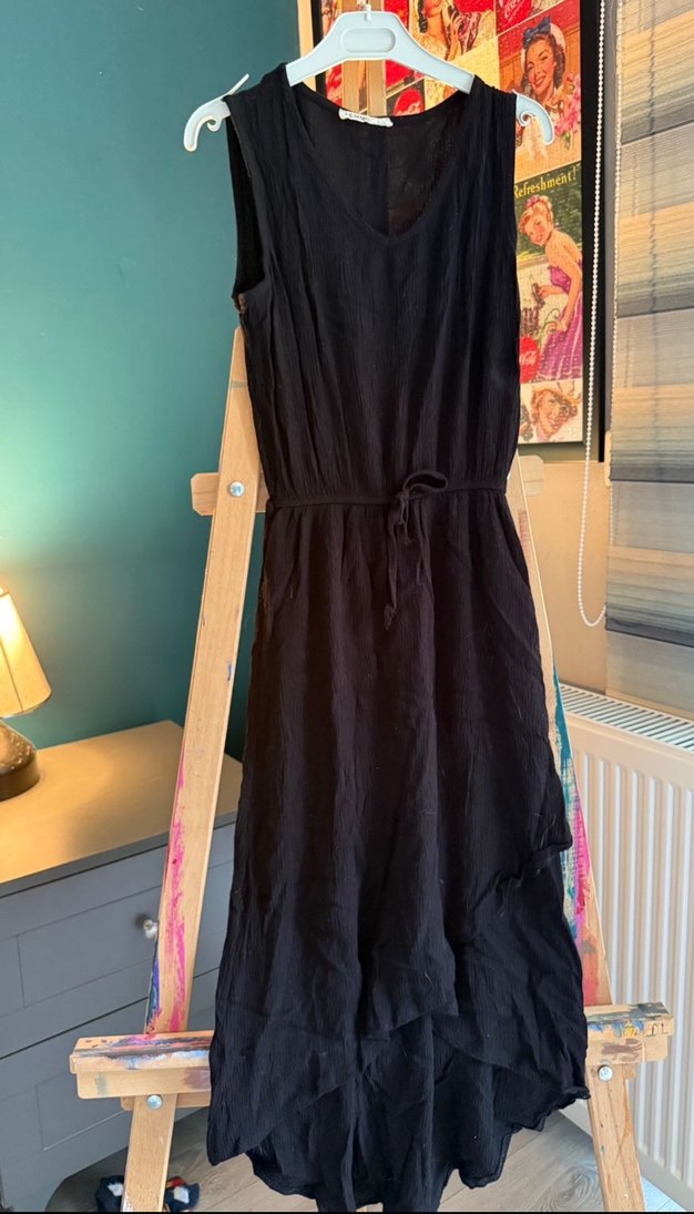 Siyah keten kumaştan, kolsuz, V yakalı, bol kesim ve drapeli uzun bohem elbise. Günlük kullanıma uygundur. Eteği önden kısa arkaya doğru uzayan katları var.