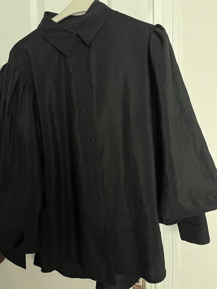 Siyah keten kumaştan, dökümlü tasarıma sahip, yakalı ve uzun kollu gömlek. Gevşek kesim ve normal midi boyda, gotik ofis tarzı için uygun.