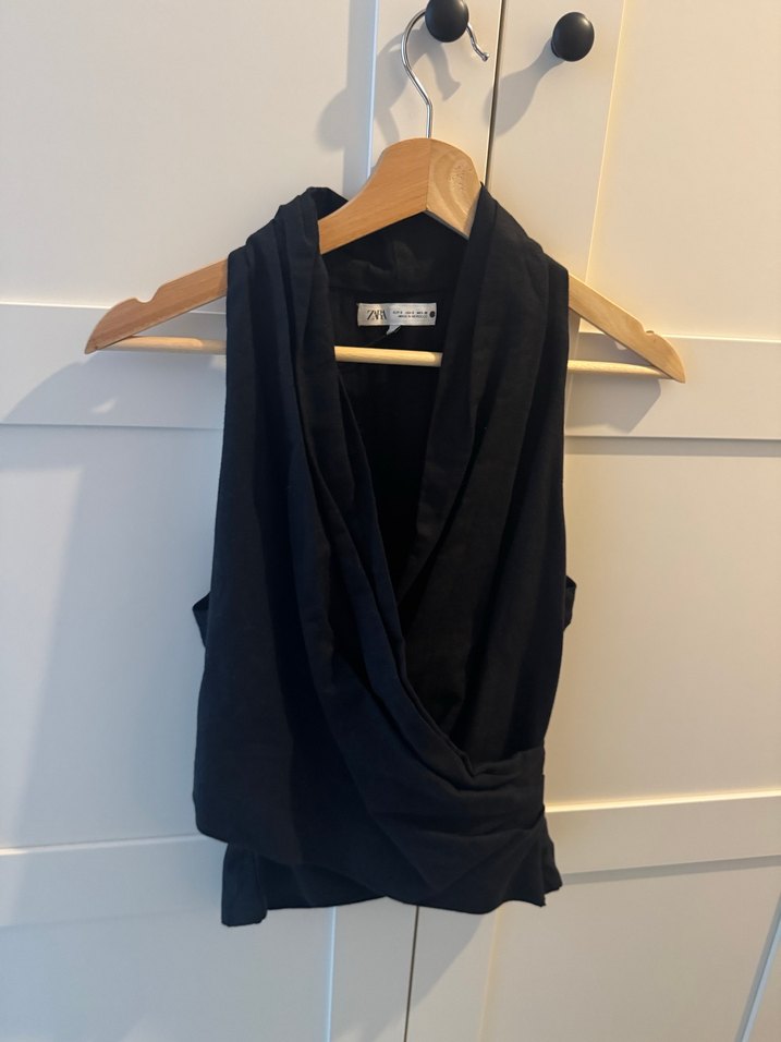 Kolsuz siyah keten bluz, drapeli yüksek yakaya ve vücuda oturan midi boy kesime sahiptir, şık sokak modası için uygundur.