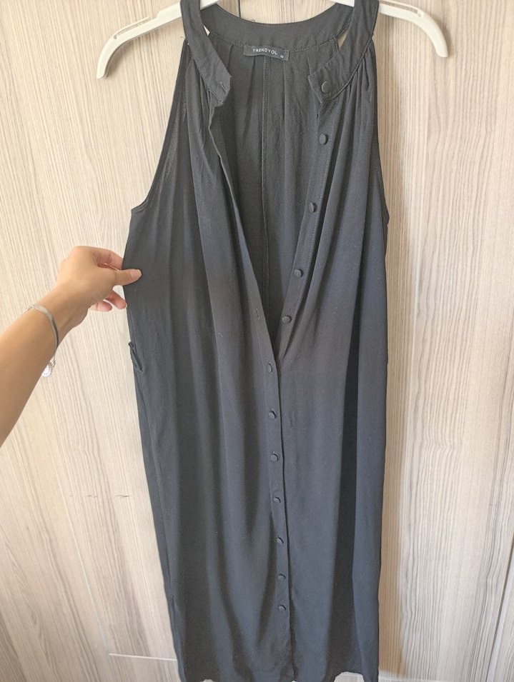 Siyah keten kumaştan, düğmeli ve halter yakalı, uzun kollu olmayan bol kesim elbise, günlük kullanım için uygundur. Yandan yırtmaçı var