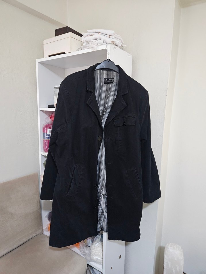 Siyah keten kumaştan yapılmış, düğmeli erkek ceket. Notlu yaka, normal uzunluk ve regular fit ile ofis ve günlük kullanım için uygun.