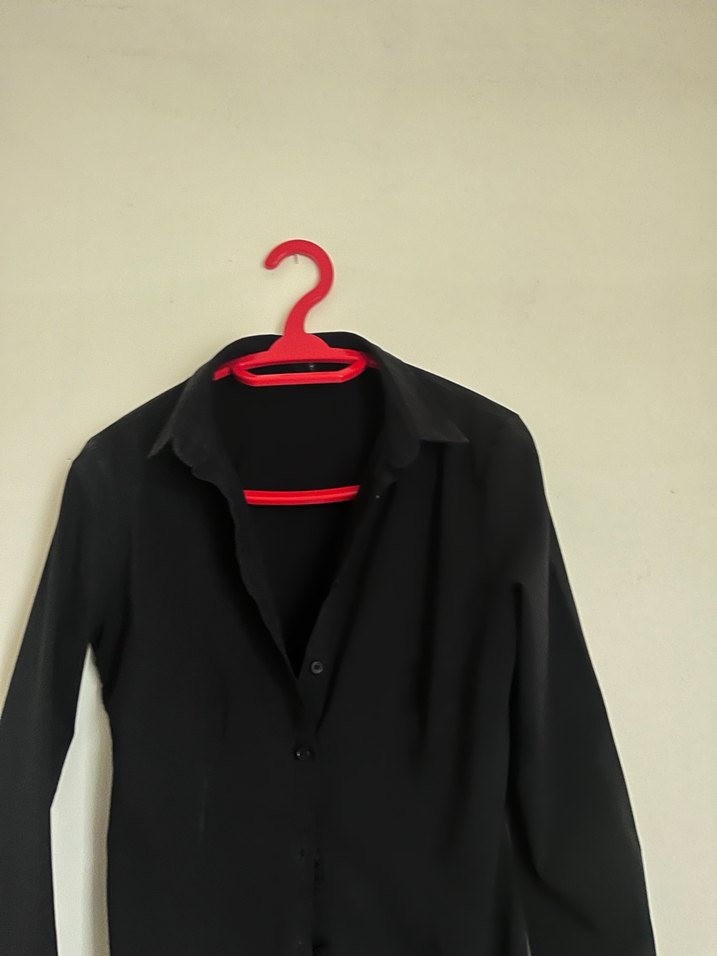 Siyah keten kumaştan, düğmeli, yakalı ve fitted uzun kollu minimalist goth tarzında kadın gömleği. Günlük kullanım için uygundur. ✨