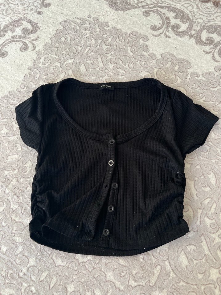 Kısa kollu, düğmeli, keten siyah bluz, tekne yaka ve dar kesimiyle trend goth tarzına uygundur. İkisi birlikte