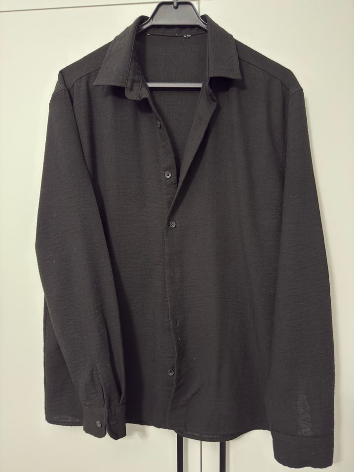 Siyah keten kumaştan, düğmeli, uzun kollu, yaka detayı notched lapel olan, rahat kesim ve midi boyda erkek gömleği. Ofis için uygun minimal tasarım.