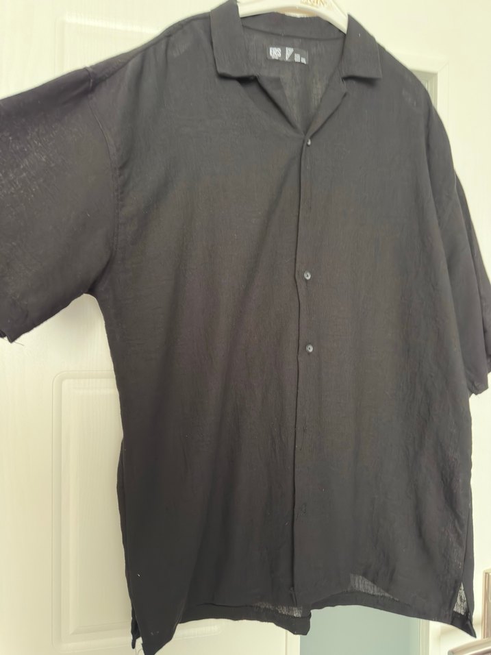 Siyah keten erkek gömlek, kısa kollu ve salaş kesimdir. Minimalist, günlük rahat stil sunar.