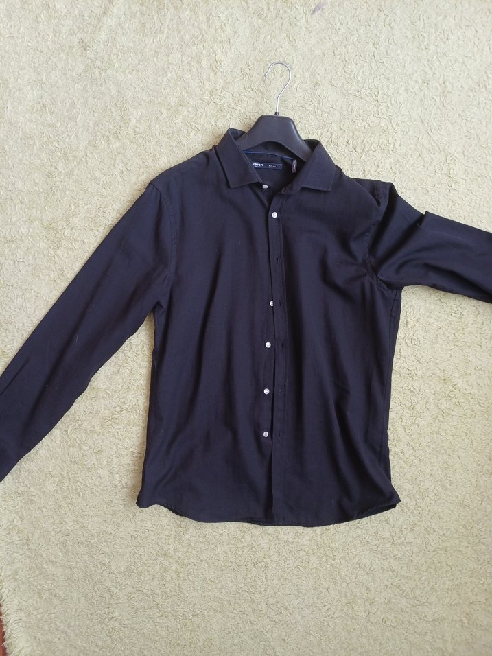 Siyah keten kumaştan üretilmiş, yakalı ve düğmeli erkek gömleği. Uzun kollu ve regular fit kesime sahip, sade ve desen içermeyen tasarım.