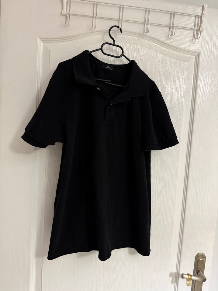 Siyah keten erkek polo tişört, düğmeli kısa kollu ve yakalıdır. Bol kesim ve normal boydadır, günlük rahat kullanım için uygundur.