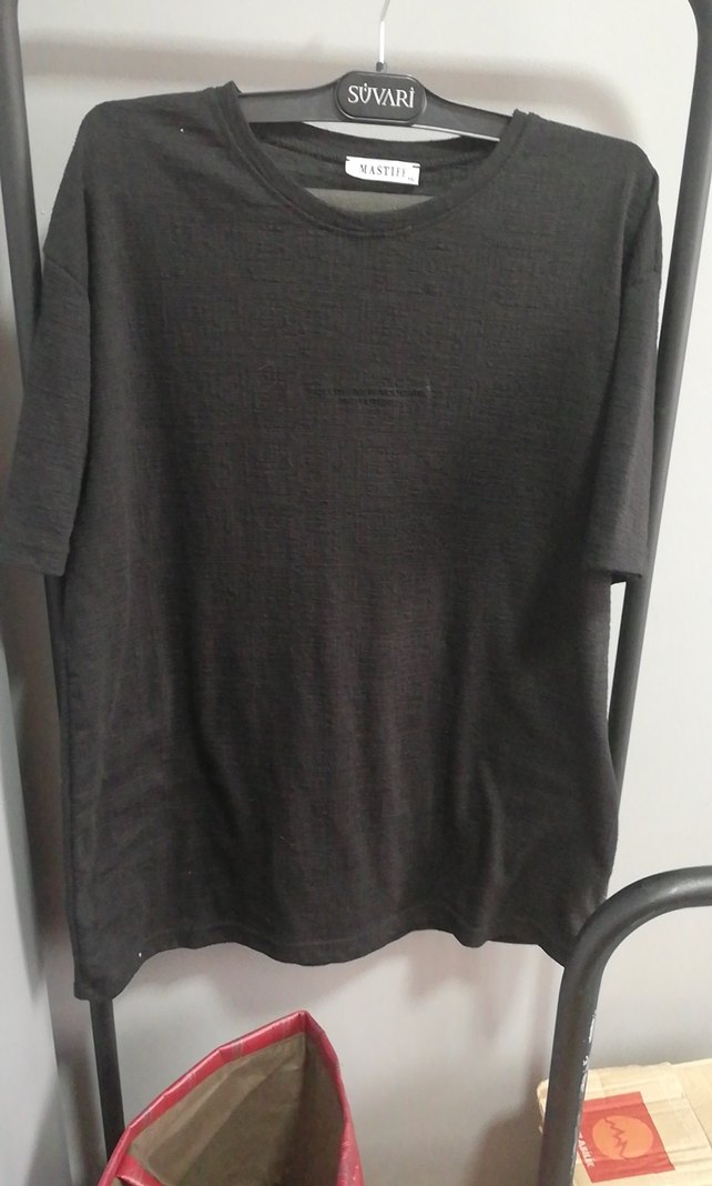 Siyah keten erkek tişört, yuvarlak yaka ve kısa kollu. Loose fit. Likrası var. Koltuk altı ön genişlik 58 cm. Omuzdan etek boyuna 70 cm civarı