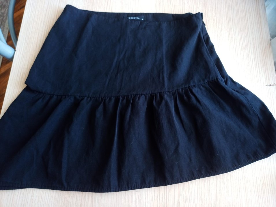 Siyah keten kumaştan, fırfırlı ve bol kesim midi etek. Minimalist ve gotik tarzda, romantik akşamlar için uygun.