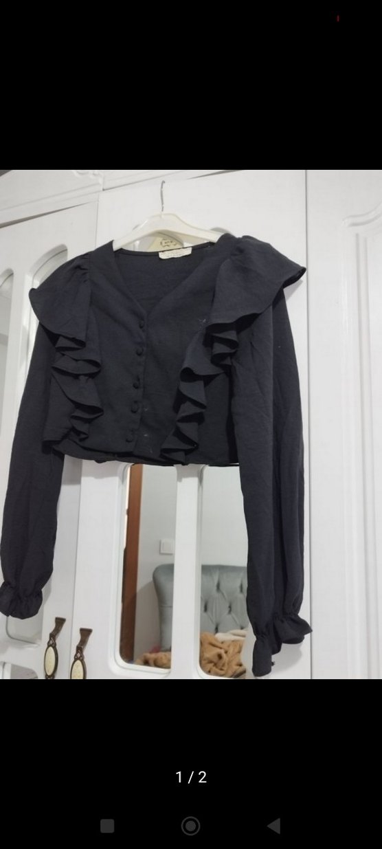 Siyah keten bluz, uzun kollu ve bol kesimdir. V yaka ve ön kısmında fırfır detayları bulunur, günlük kullanım için Paris tarzı gotik bir görünüm sunar.