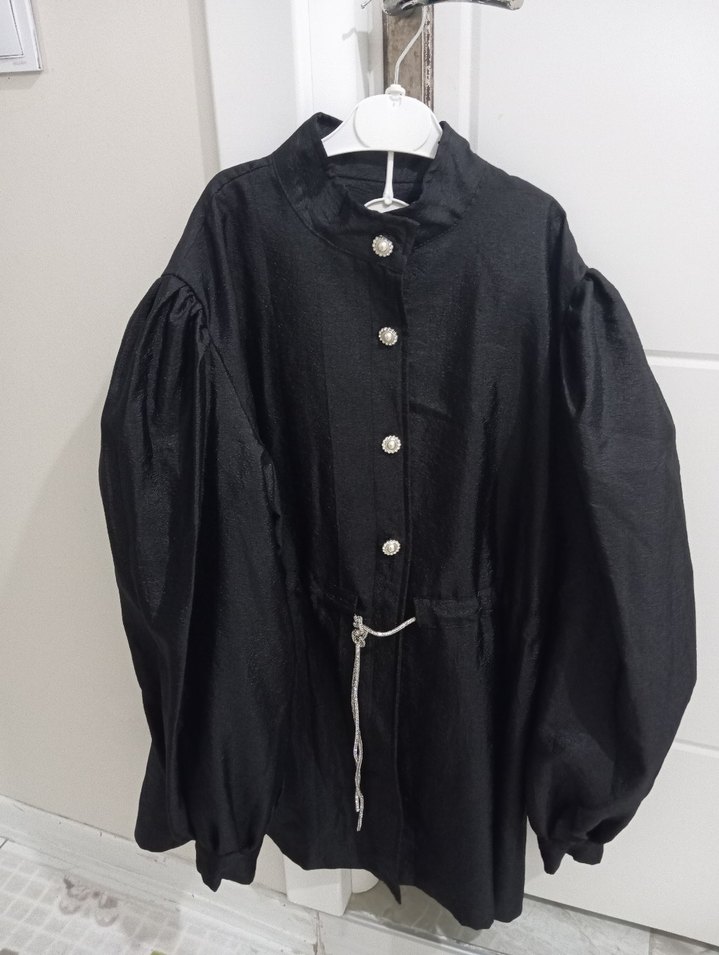 siyah keten gömlek, uzun kabarık kollu, yakalı ve bol kesimlidir. Önünde düğmeler ve belde ince bir ip bulunmaktadır.