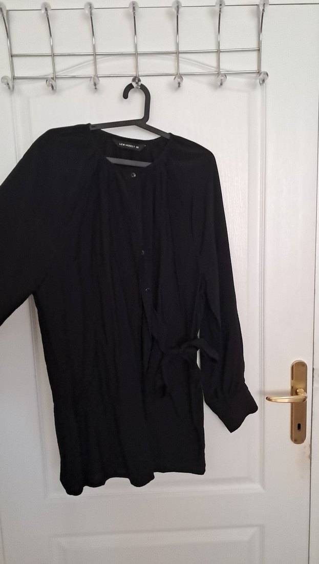 Bol kesim siyah keten gömlek, uzun kollu ve yüksek yakalıdır. Düğmeli ve minimalist goth tarzıyla ofis kullanımına uygundur.