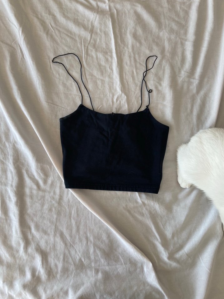 Siyah keten kumaştan, ince askılı halter yaka ve normal boyda, minimal ve sokak stili uyumlu crop top.